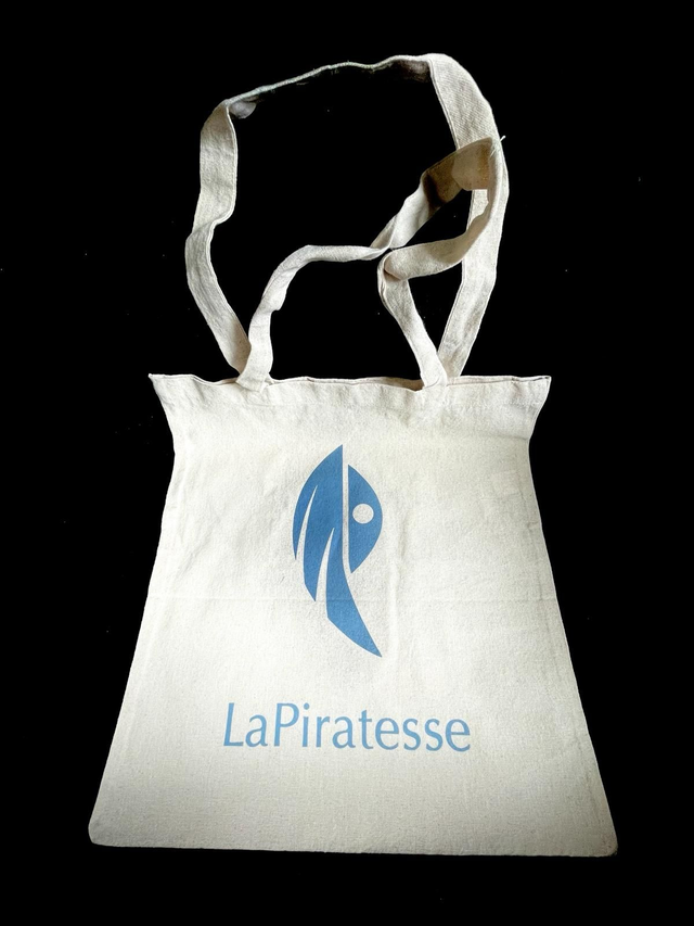 linnen totebag with LaPiratesse logo on one side and a quote on the other side